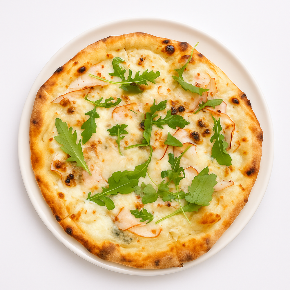 Тісто на заквасці, вершкова основа , копчена курка, печериці, сир моцарелаВага: 530г, Ø28см