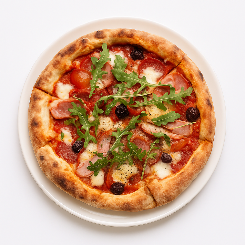 Тісто на заквасці, томатна основа, сир моцарела, салямі, томати, оливки Каламато, пармезан, свіжа руколаВага: 560г, Ø28см