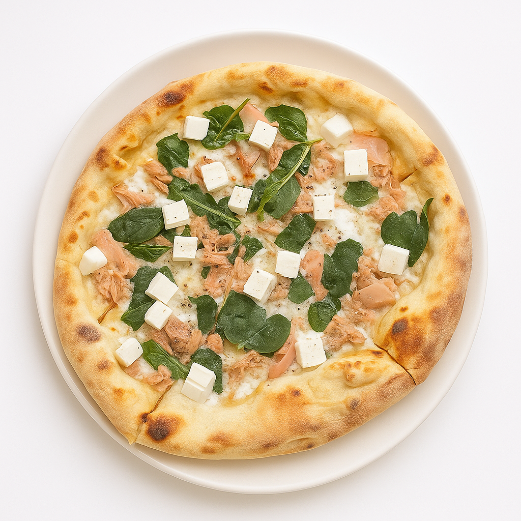 Тісто на заквасці, вершкова основа, сир Фета, тунець, шпинат